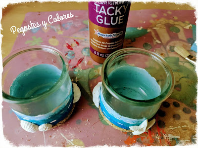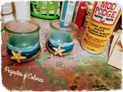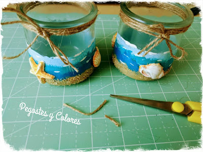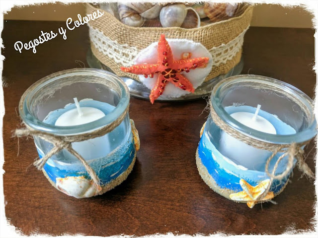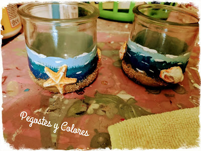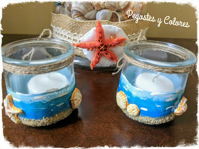 Tenia el plan de hacer algo con alambre, pero ya no alcance de tiempo y como lo que me sobran son frascos, aquí me tienen reciclando para hacer un par de portavelas, que no solo son veraniegos, son estilo marinos.