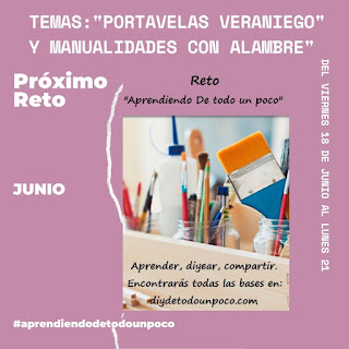 En el Reto "Aprendiendo de Todo un Poco" del blog DIY De todo un poco de Anna Llansa, hay dos muy buenos temas para el mes de Junio. El reto comienza el viernes 18 de Junio (Hoy) y termina el lunes 21 de Junio, asi que si te animas tienes todo el fin de semana.