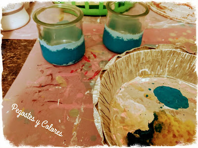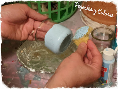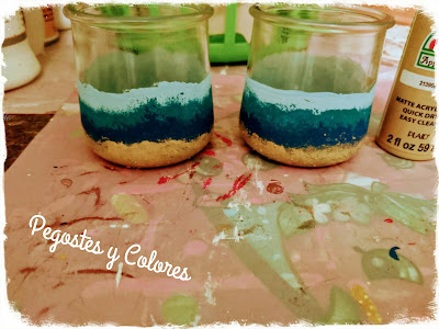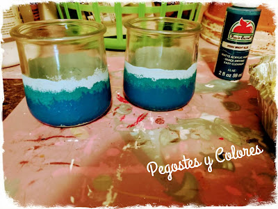 1.- Antes de trabajar los frascos tienen que estar libres de grasas y pegamento. Con una esponja dando toques pintamos con azul pastel desde abajo hasta un poco mas de la mitad hacia arriba por todo alrededor, dejamos secar.