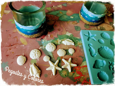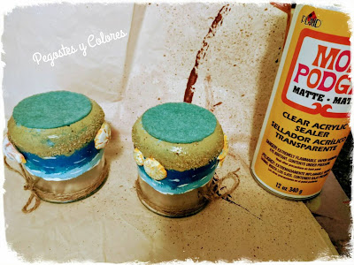 5.- Hacemos unas figuras con pasta de secado al aire, de conchas, estrellas de mar, etc. Sin dejar que sequen las pegamos con tacky glue en los frascos, haciendo que tomen la forma. Dejamos secar.