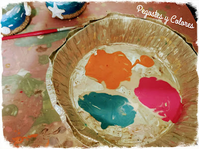6.- Mezclamos cera liquida con naranja, rosa y turquesa. Pintamos con cuidado las formas marinas y con un pano húmedo retiramos la pintura, solo es para dejar patina. Primero puse naranja y quite el color, luego rosa y al ultimo turquesa, siempre quitando la pintura y dejando que se quede algo de ella en los dobleces y pliegues de las piezas. Dejamos secar.