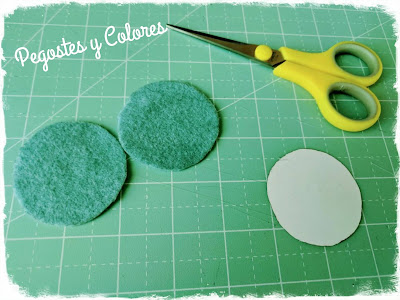 9.- Cortamos dos círculos en fieltro del tamaño de las bases de los frascos y las pegamos con el spray adhesivo, para proteger las superficies de los muebles.